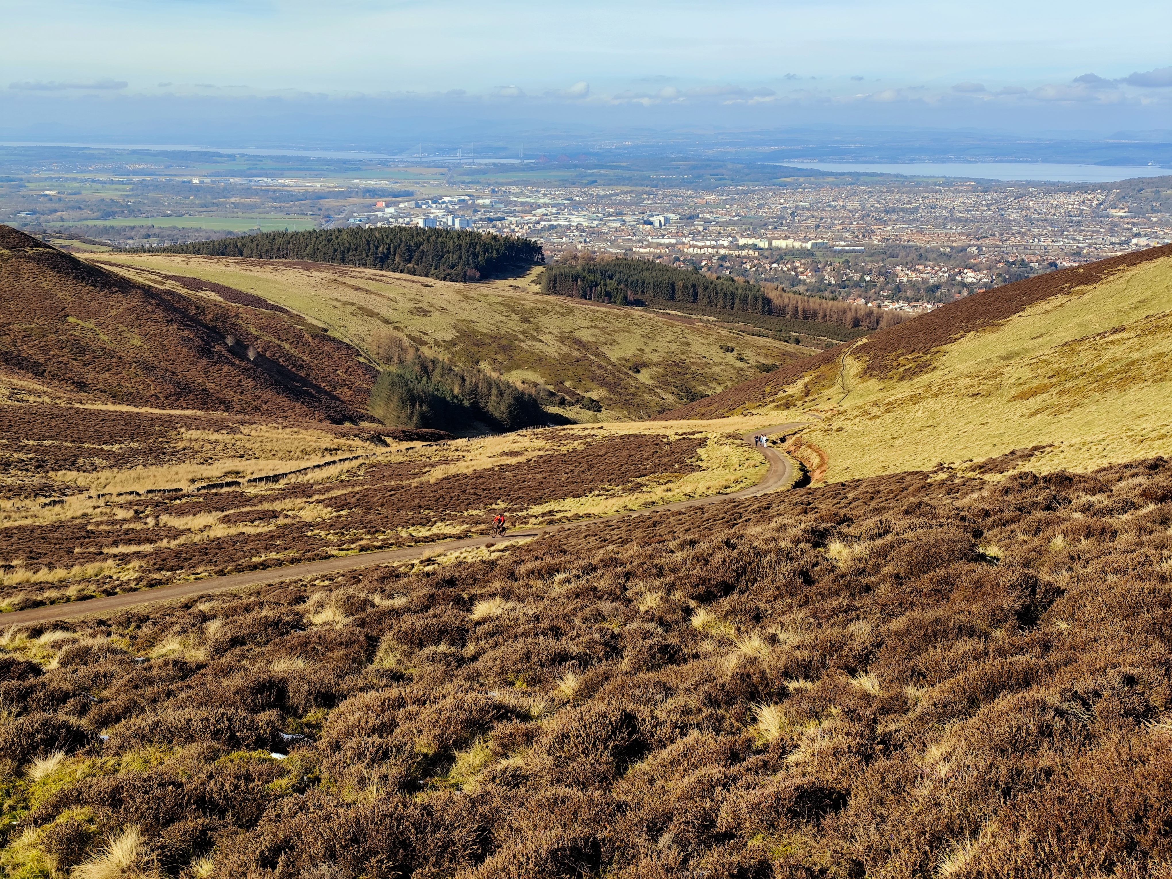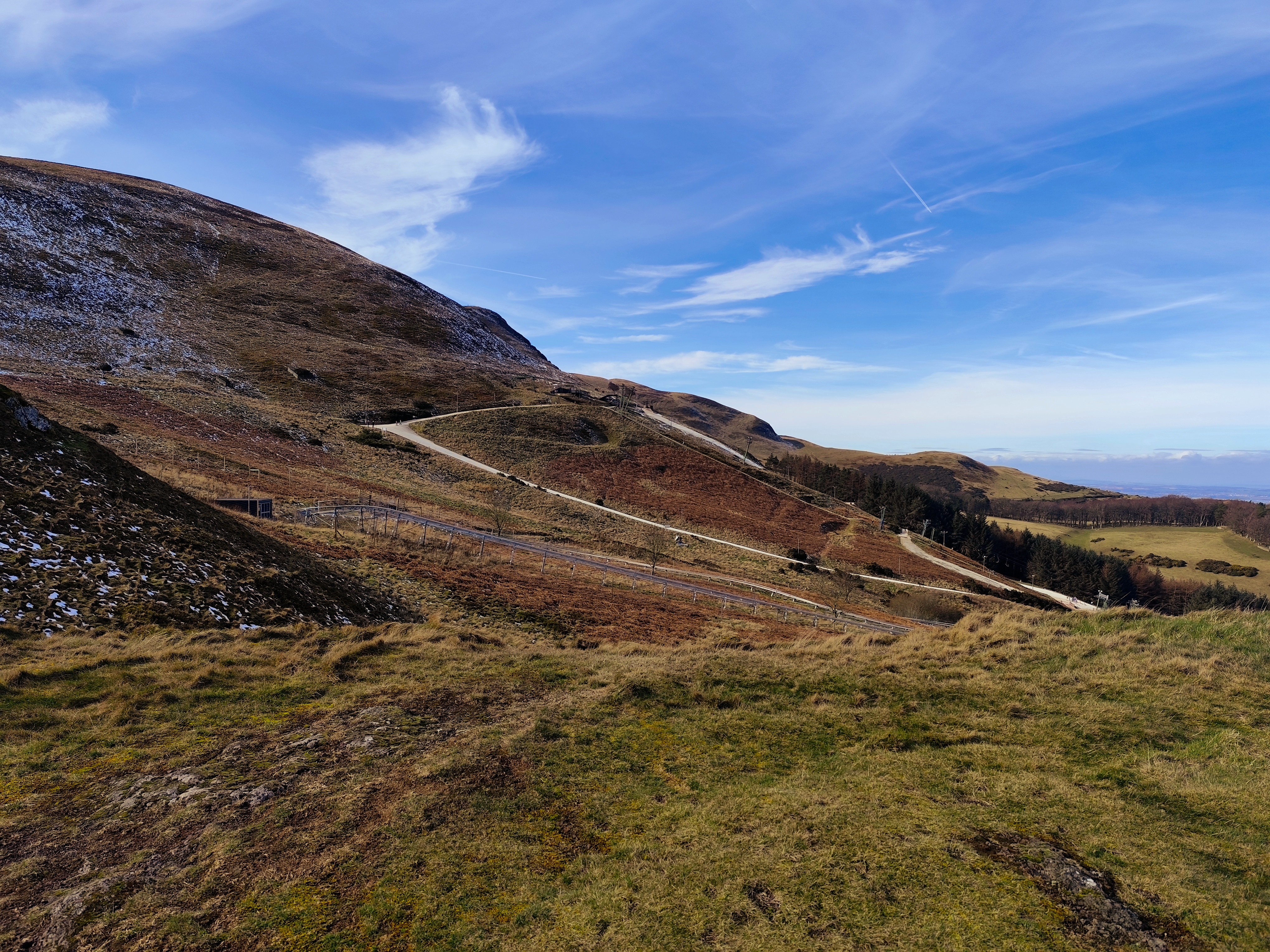 By 10 o'clock in the morning, I caught the bus to the foot of the Pentland hill, which took about 45 minutes. Instead of stopping at the foot of the hill, the bus climbed up to the ski base camp. Previously, there were no bus routes to this location, so it was a pleasant surprise. Myself and another couple were the last ones on the bus, and we remembered that it used to stop at the hill's base. We inquired with the bus driver, but he had no idea. We decided to ask at the ski base camp, where they pointed us in two directions. We thanked them for their help.