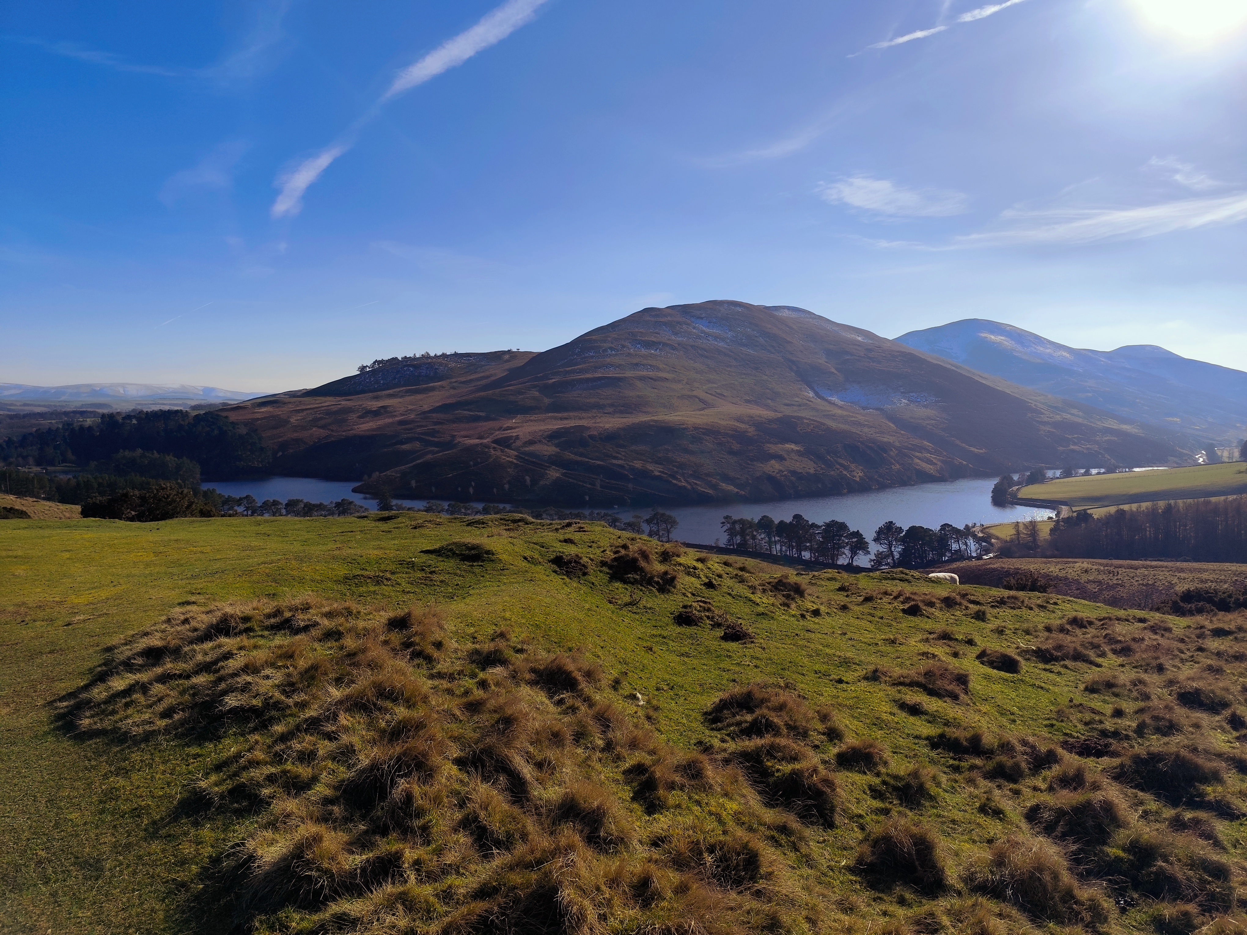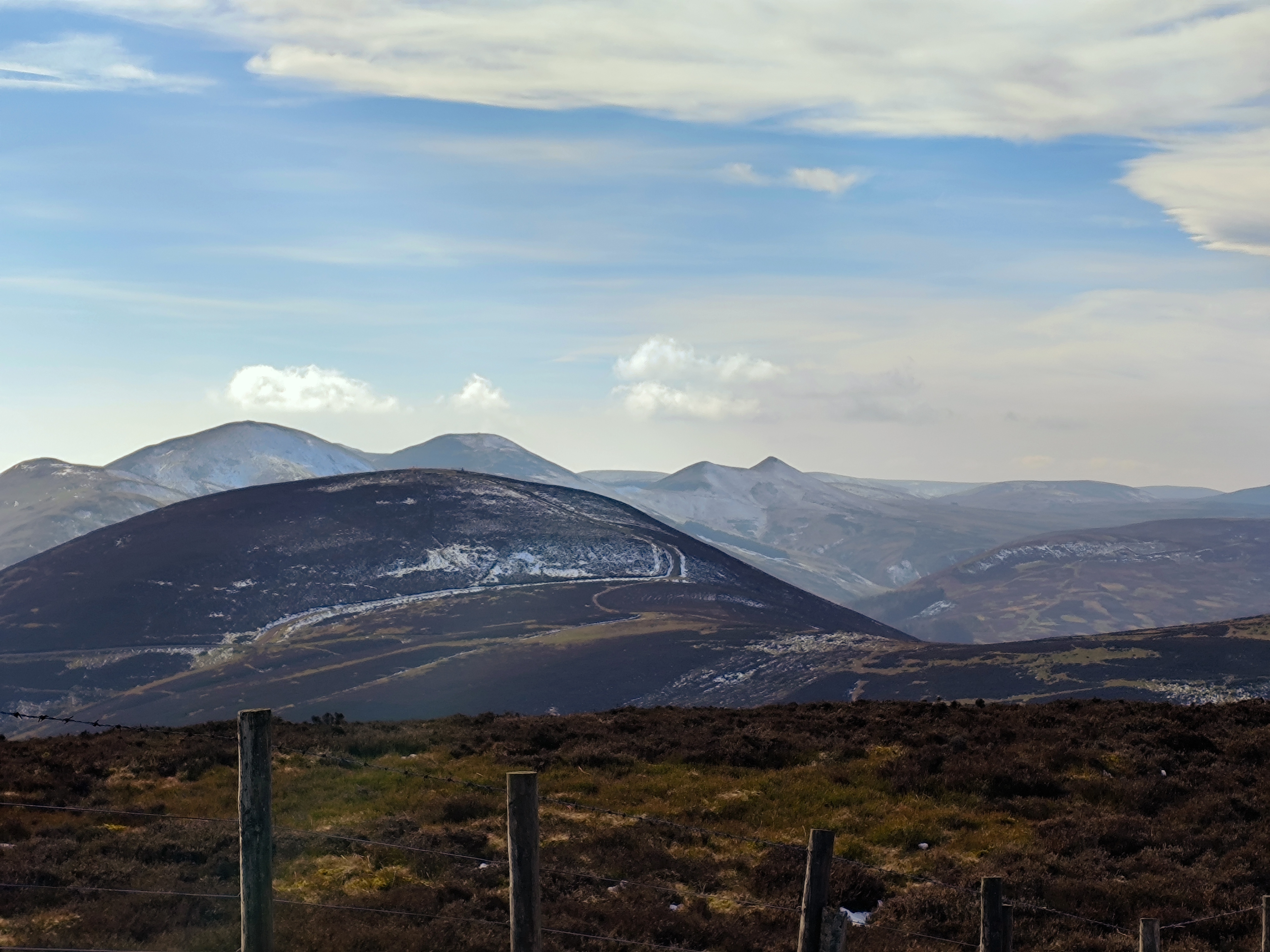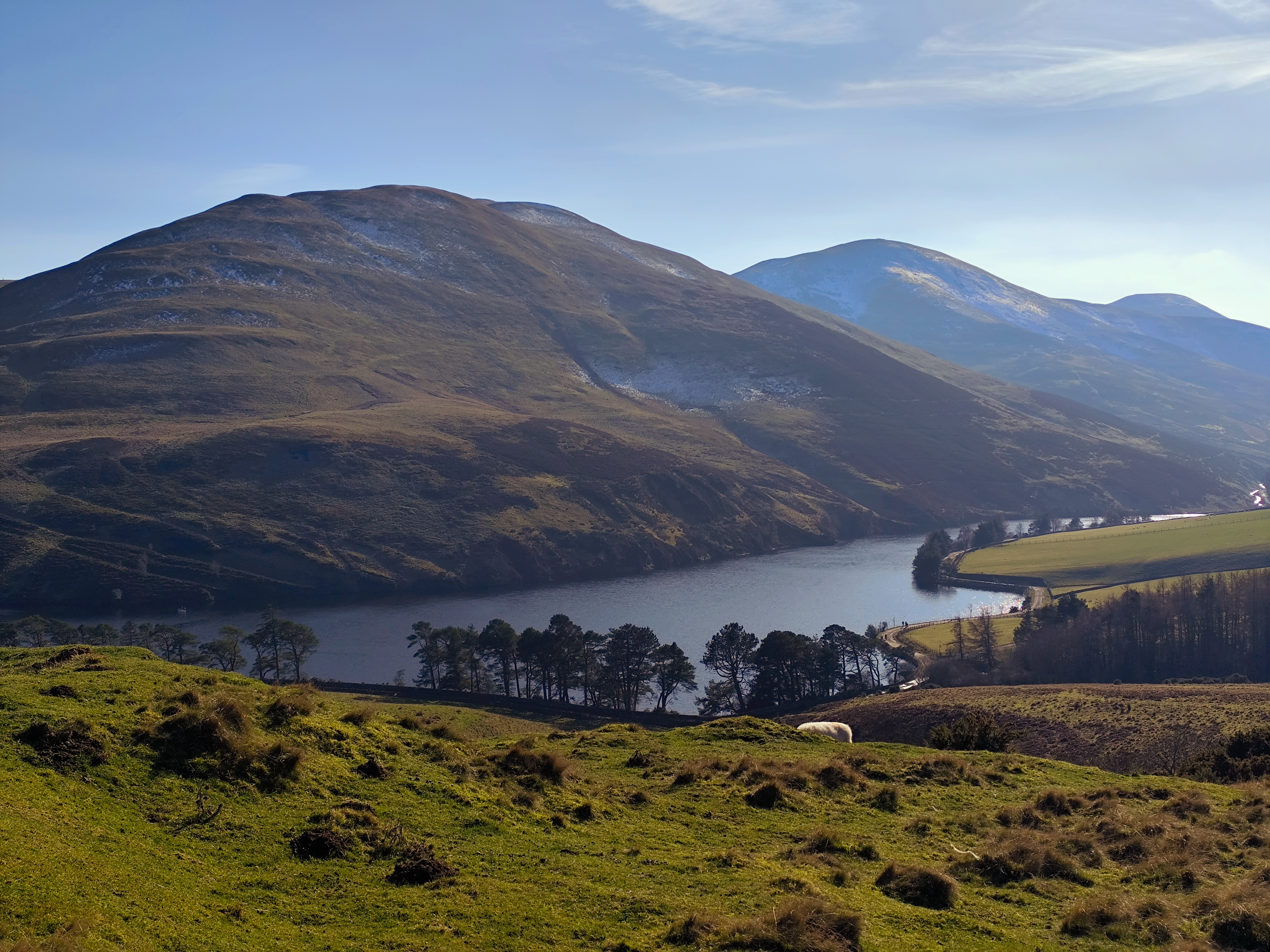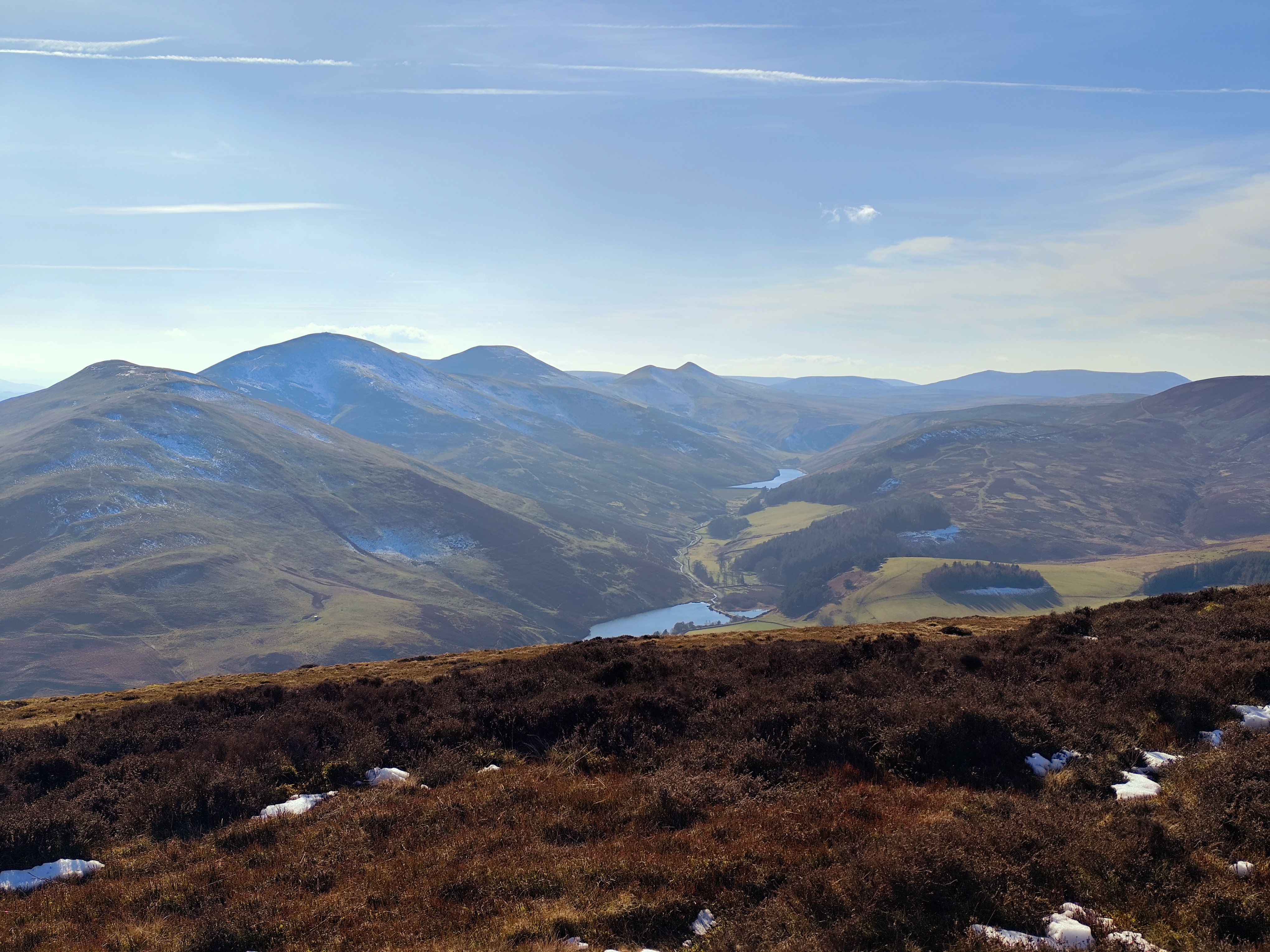 From there, the path became relatively easier. To reach the tallest peak in the Pentland Hills, I needed to cross another two hills, about a four-kilometer stretch. Once I reached the peak, the view was stunning, with a chain of hills stretching south, partially snow-covered, with the feel of accomplishment. There was a small reservoir in view, too. My initial plan was to cover either all three reservoirs or just one. By 1 p.m., I took a break, drank coconut water—my recent electrolyte replacement—and enjoyed the replenishing feel.
