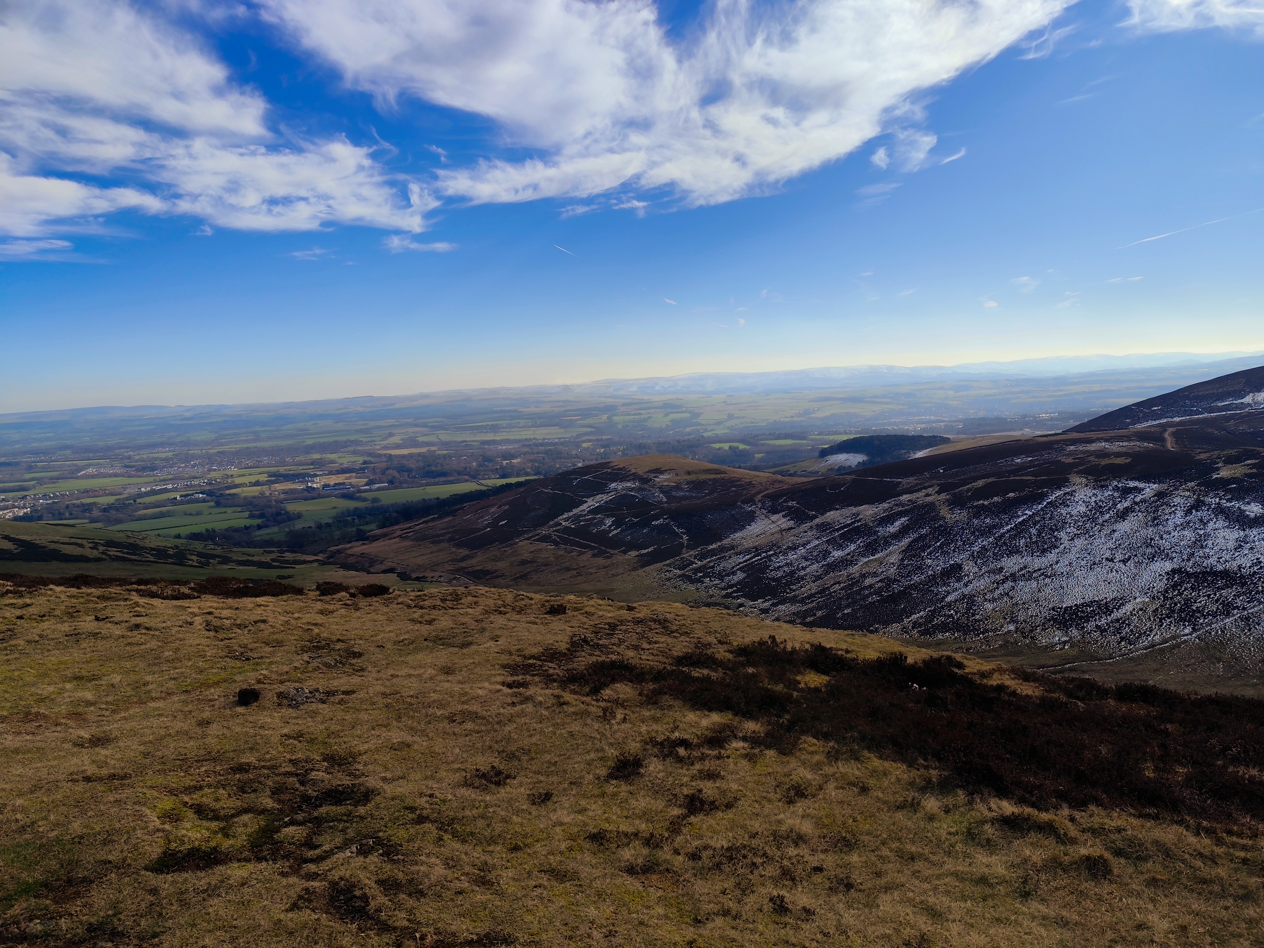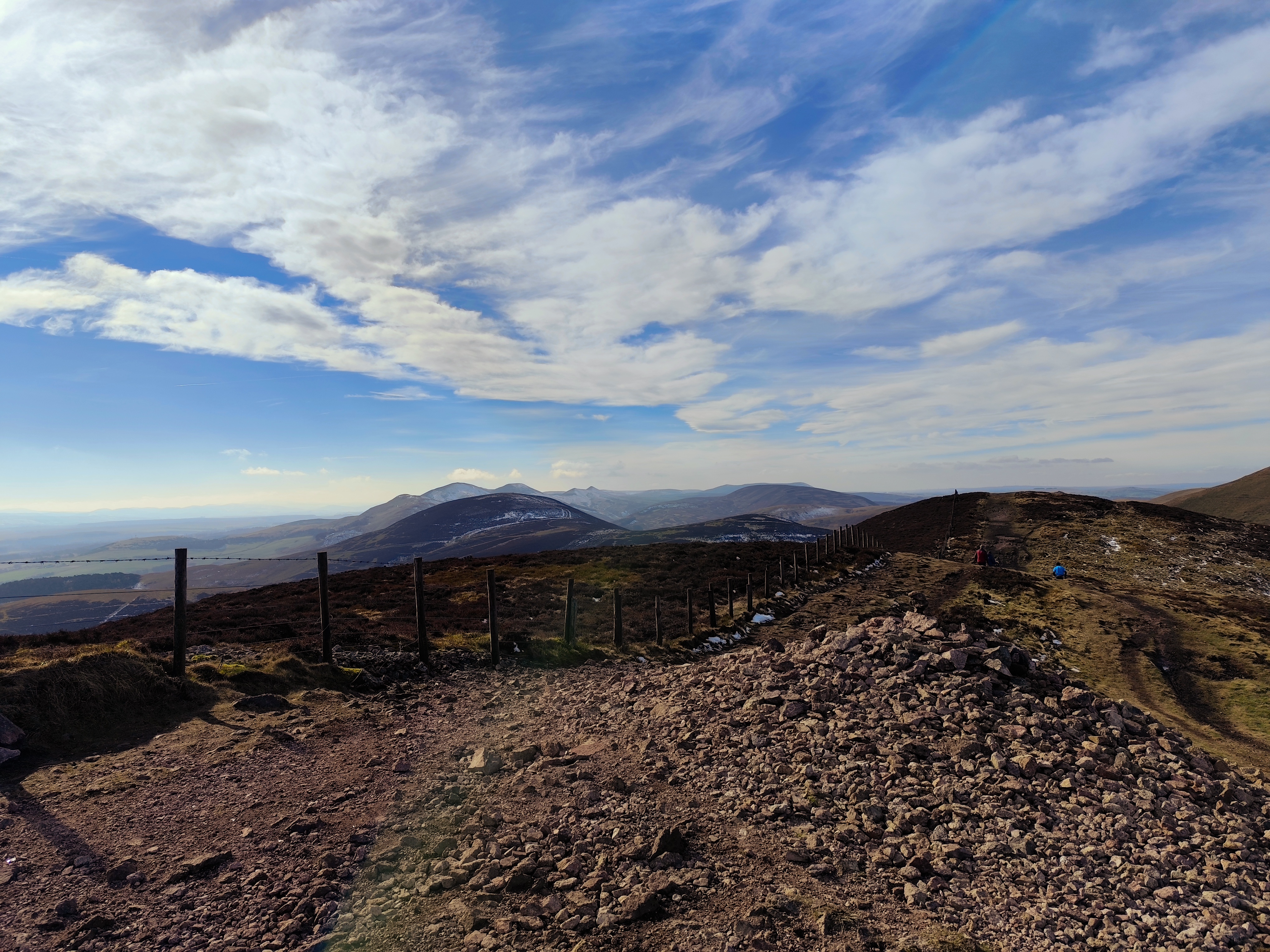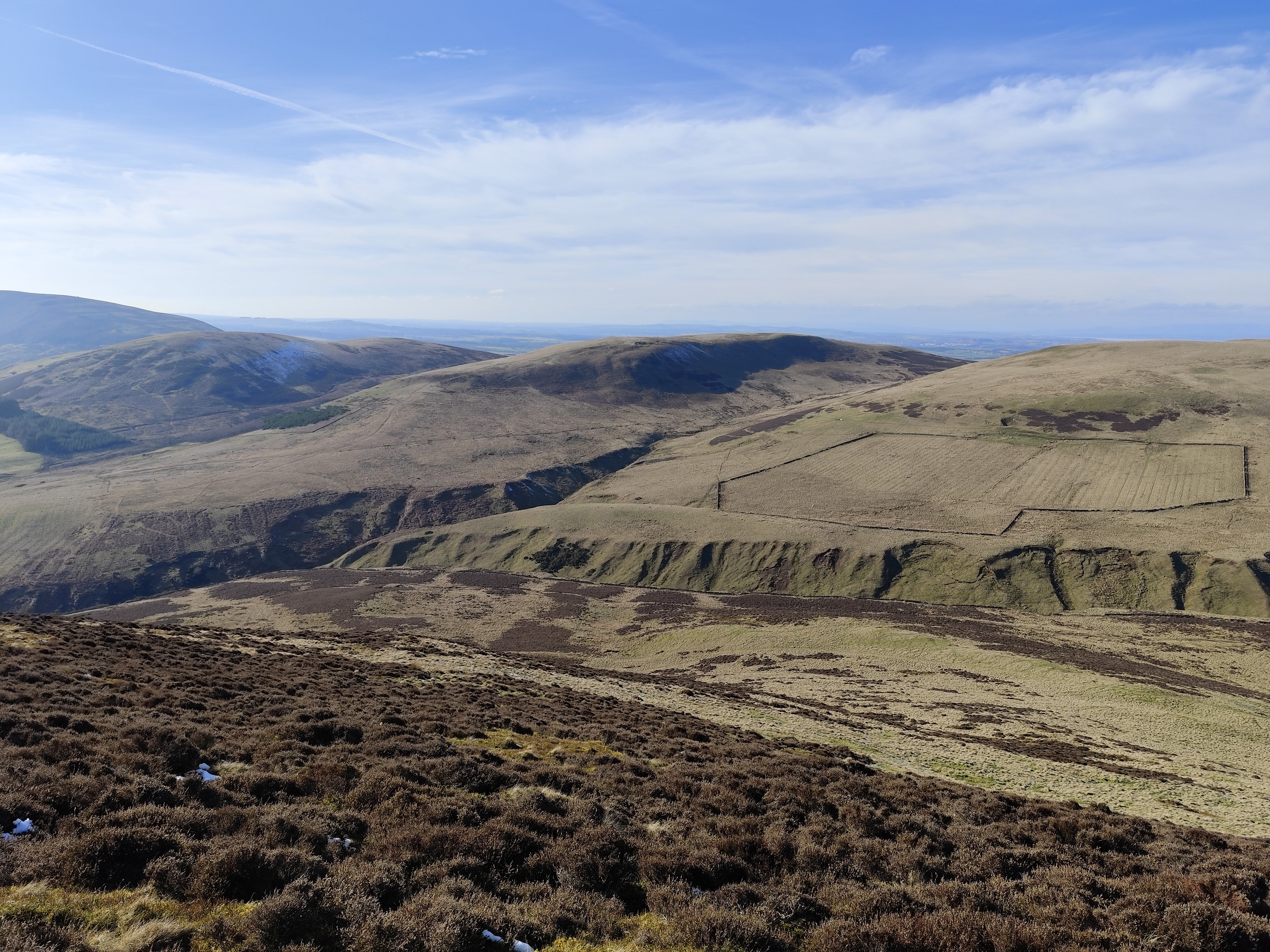 From there, the path became relatively easier. To reach the tallest peak in the Pentland Hills, I needed to cross another two hills, about a four-kilometer stretch. Once I reached the peak, the view was stunning, with a chain of hills stretching south, partially snow-covered, with the feel of accomplishment. There was a small reservoir in view, too. My initial plan was to cover either all three reservoirs or just one. By 1 p.m., I took a break, drank coconut water—my recent electrolyte replacement—and enjoyed the replenishing feel.