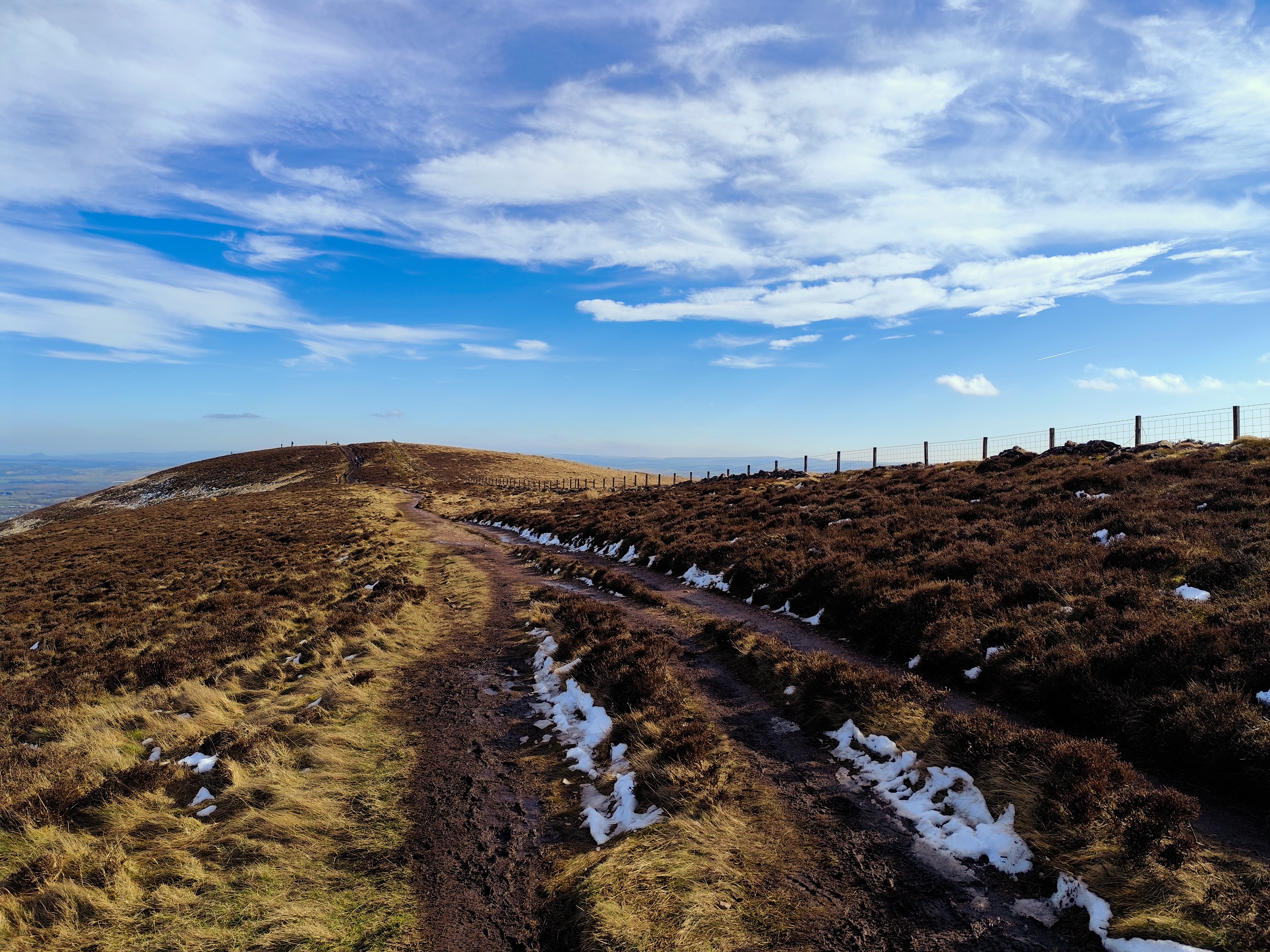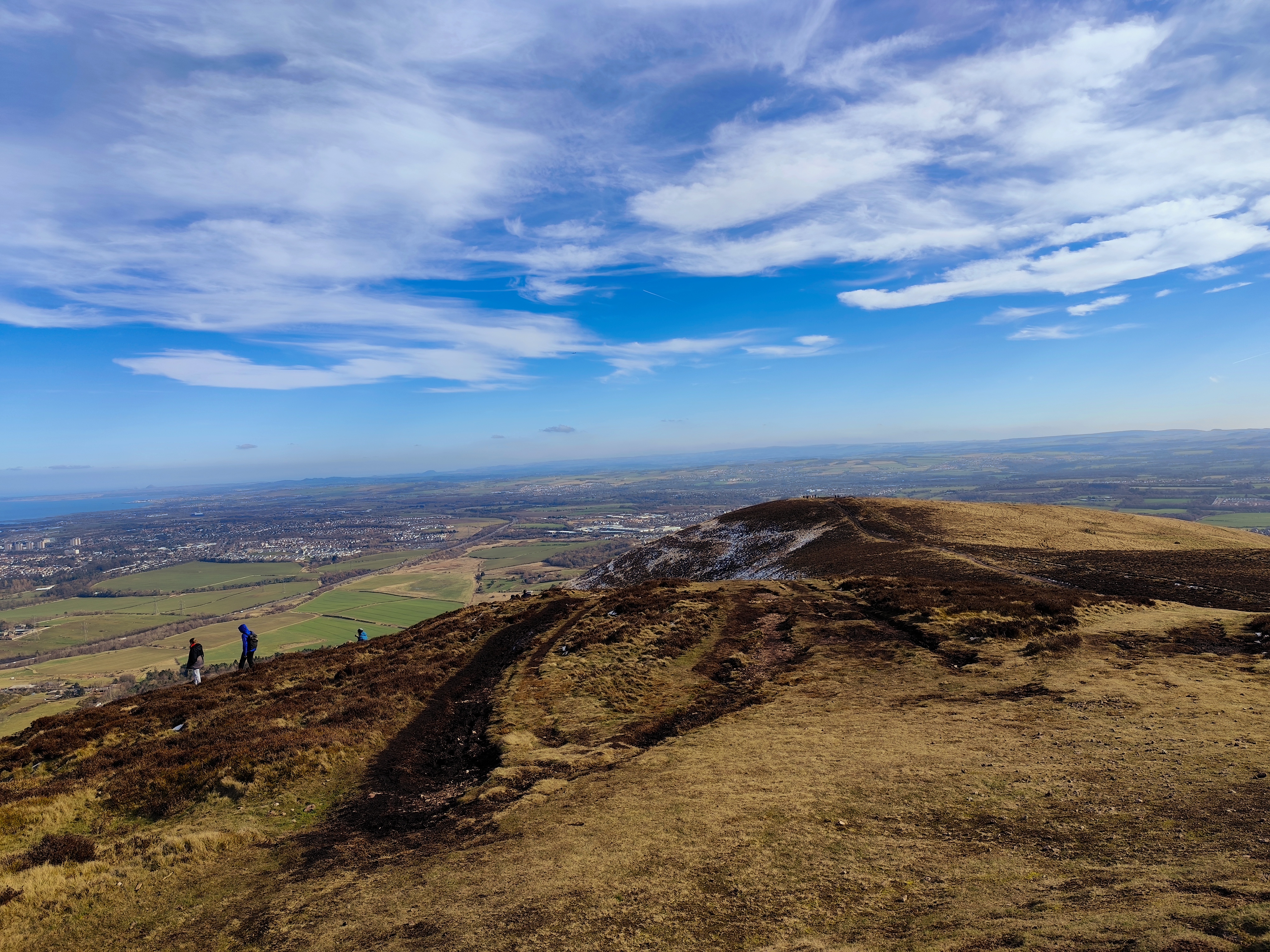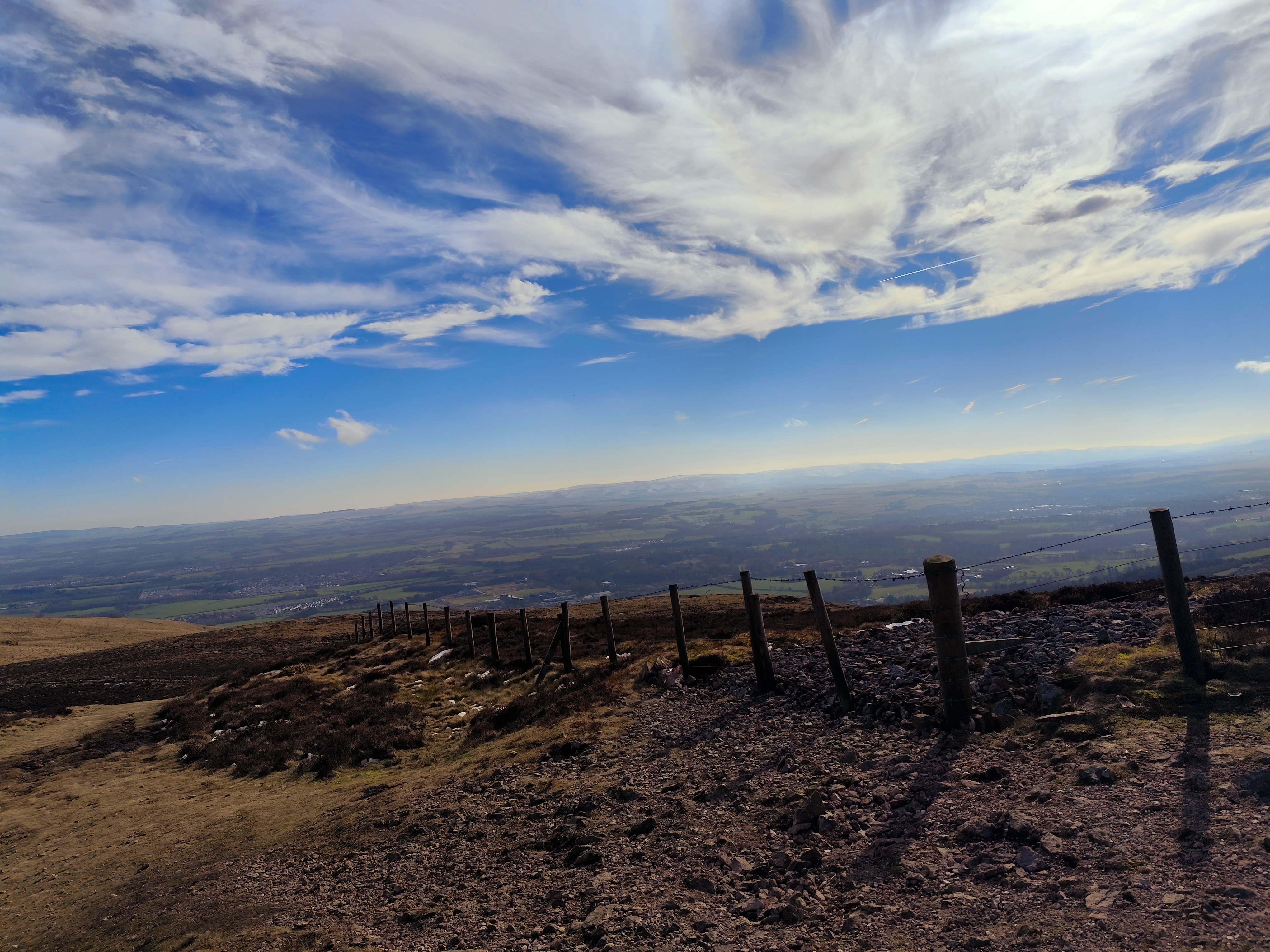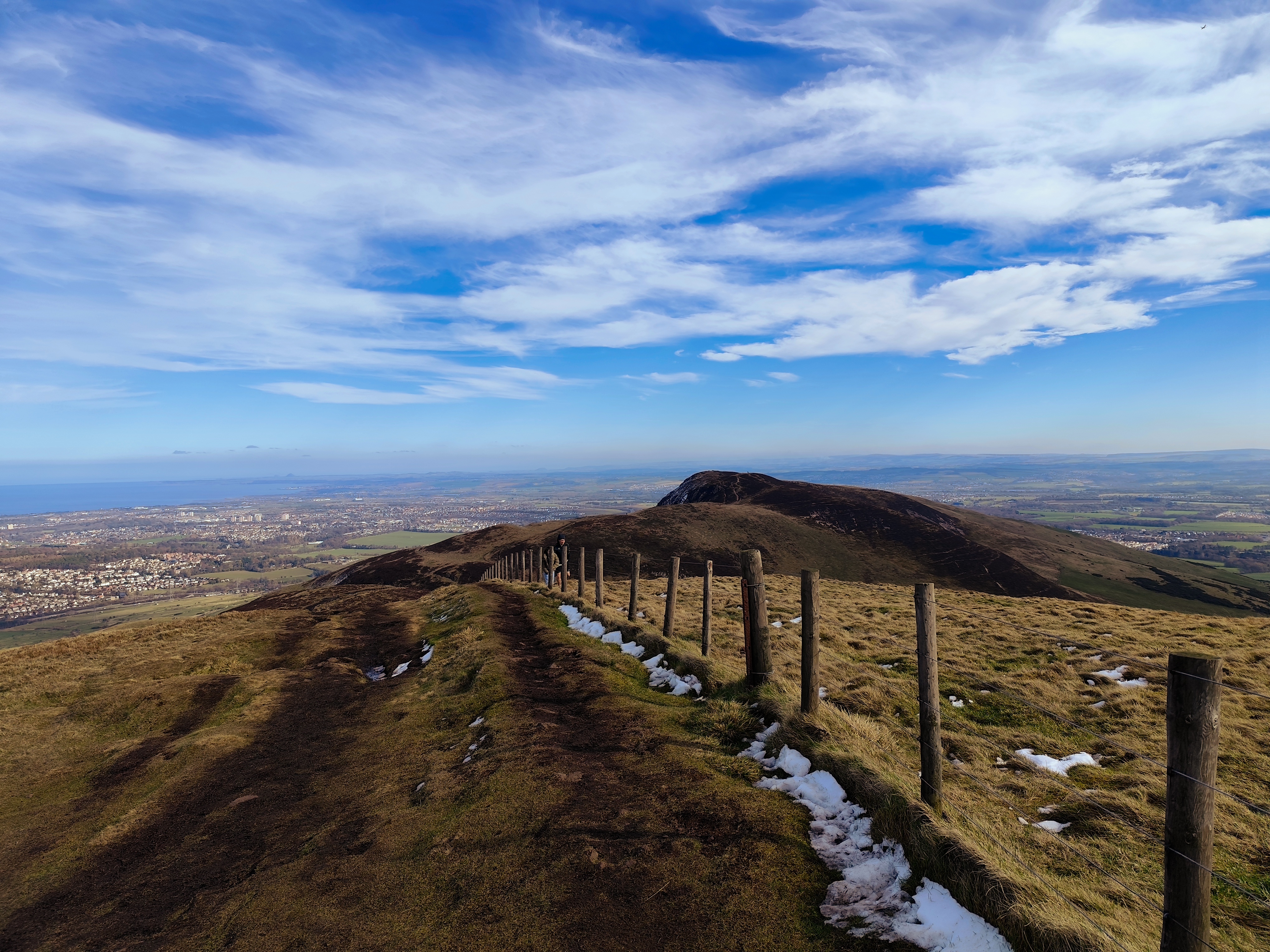 From there, the path became relatively easier. To reach the tallest peak in the Pentland Hills, I needed to cross another two hills, about a four-kilometer stretch. Once I reached the peak, the view was stunning, with a chain of hills stretching south, partially snow-covered, with the feel of accomplishment. There was a small reservoir in view, too. My initial plan was to cover either all three reservoirs or just one. By 1 p.m., I took a break, drank coconut water—my recent electrolyte replacement—and enjoyed the replenishing feel.